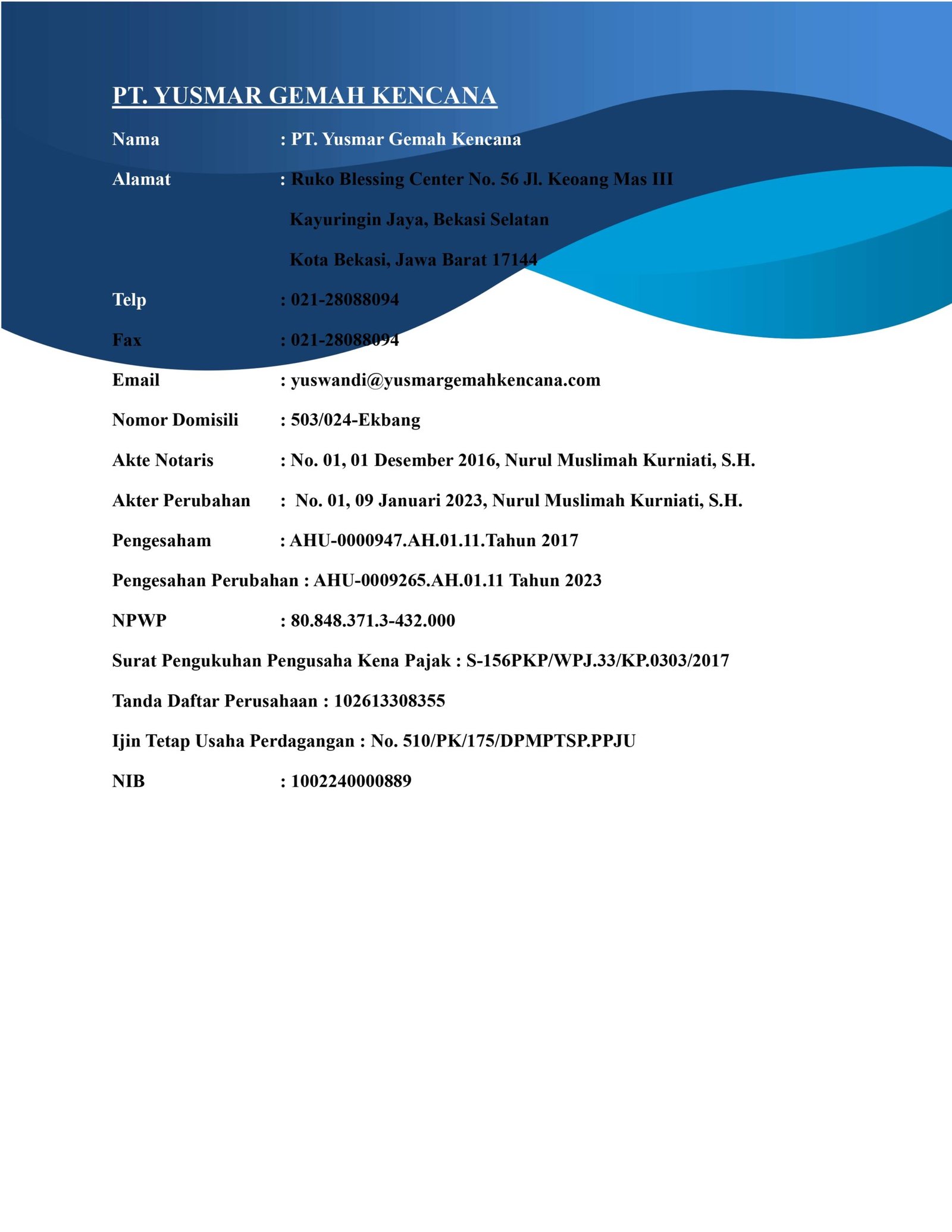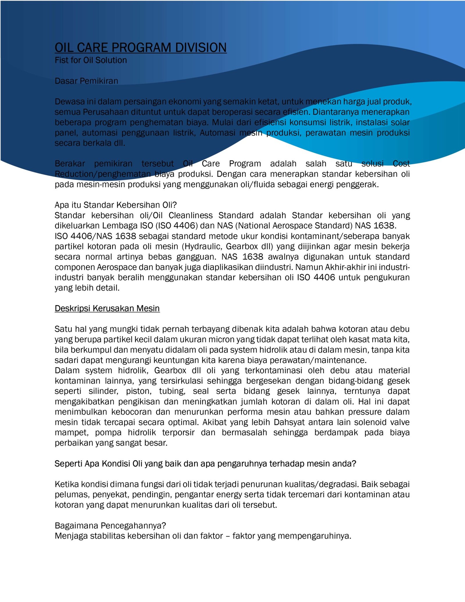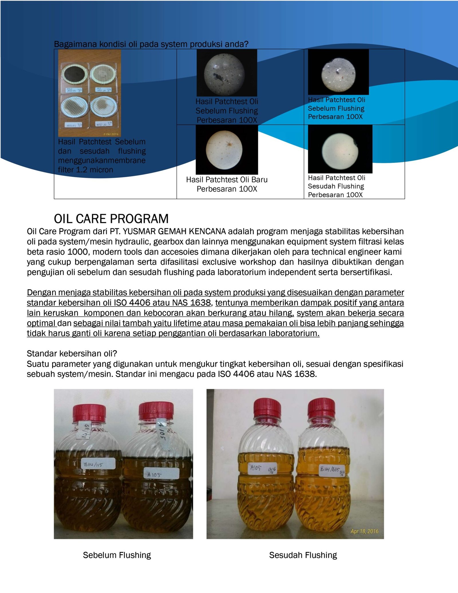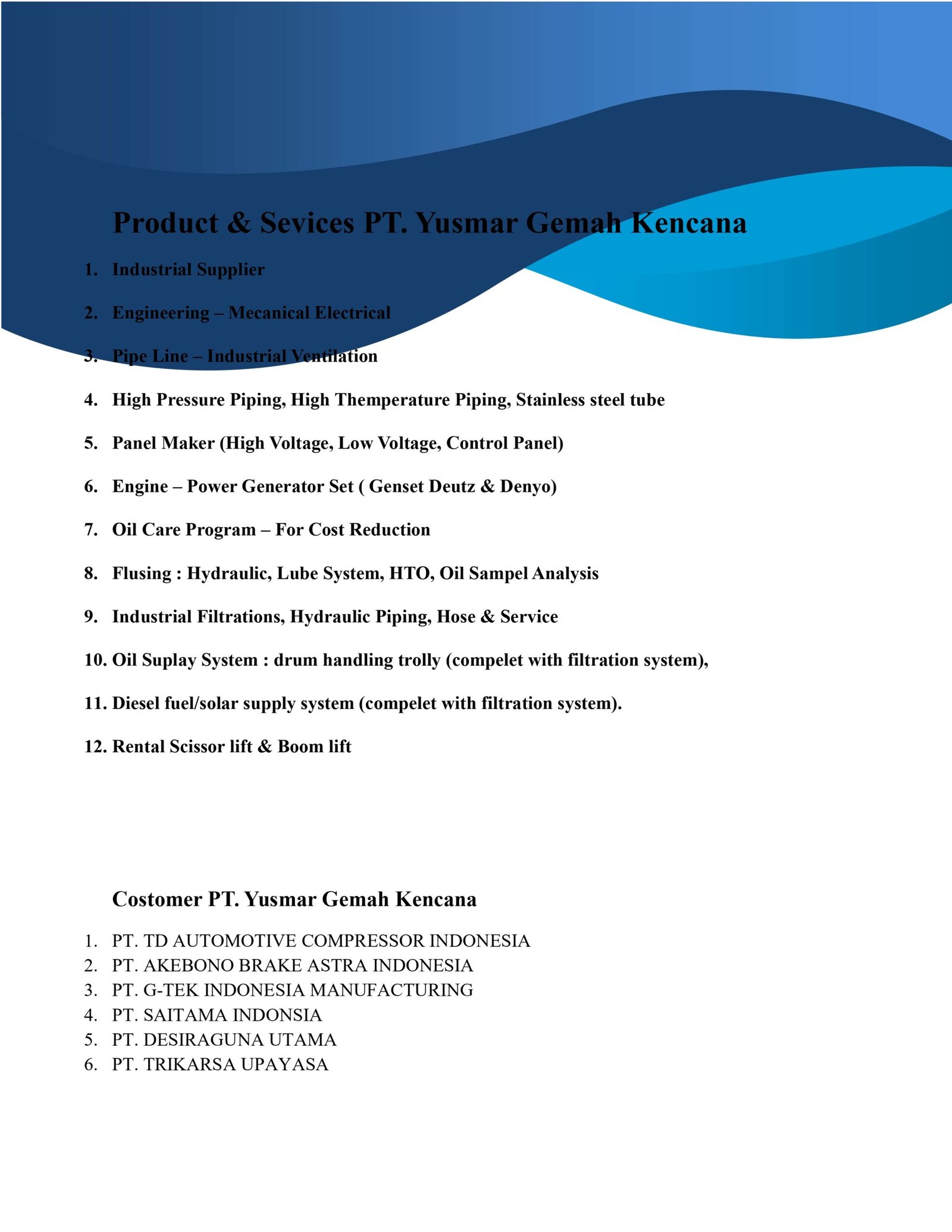Product / Service Product & Service PT. Yusmar Gemah Kencana Engineering – Mechanical Electrical – Control Panel – Pipe LineIndustrial Ventilation – High Pressure Pipe & Hose Engine – Power Generator SetOil Care Program – For Cost Reduction – Contamination Control – Oil/Fuel Flushing : Hydraulic, Lube System, HTO, Oil Sample Analysis Industrial Filtrations